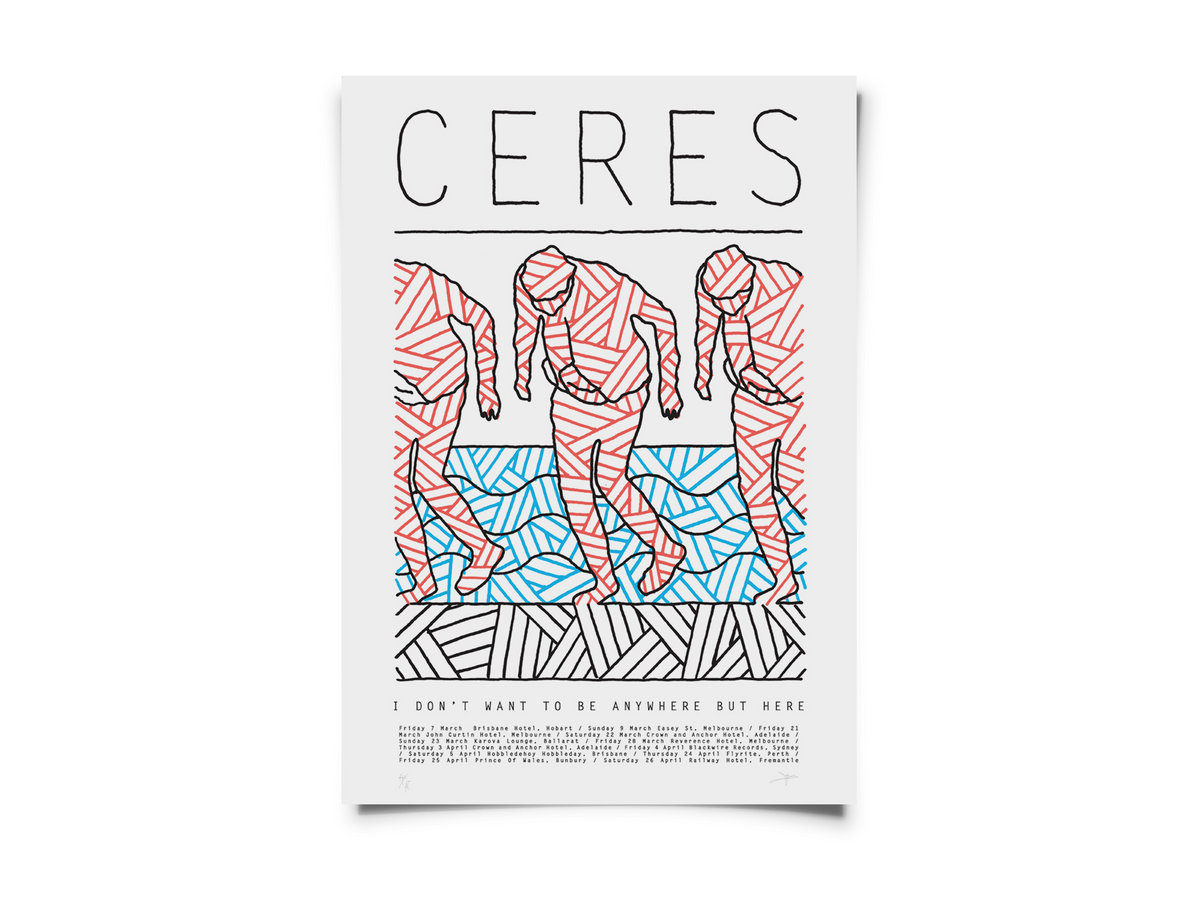 Hand silk-screened 3-colour on large 420mm x 594mm fabriano quality art stock, signed and numbered by Stephen Baker (Death By Chandelier). Out of 50 - Never reprinted. Did you want something to commemorate Ceres' first ever tour that you probably didn't go to? Well now is your chance! Ships in a tube, so shipping is a little more expensive than normal.